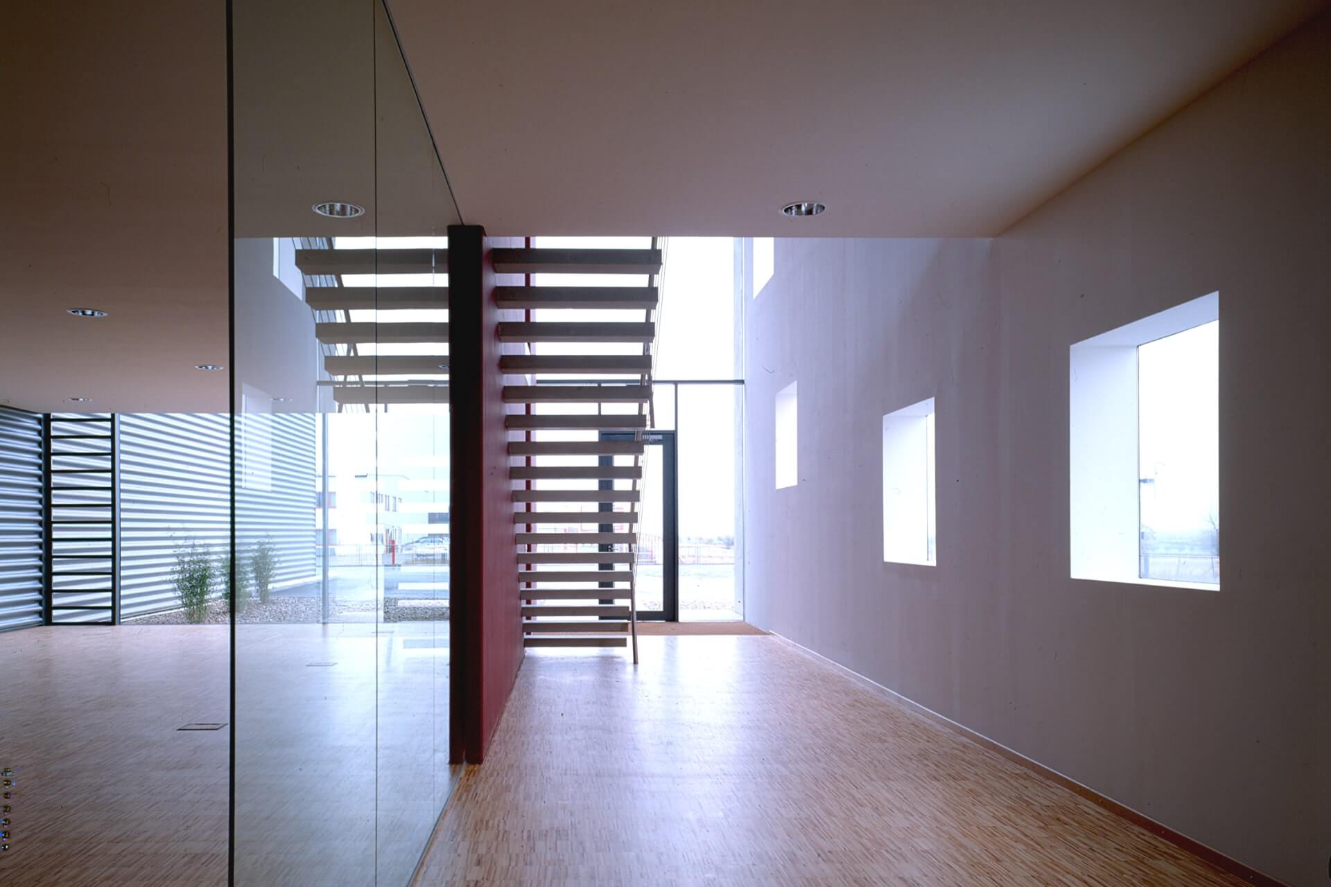 Werksanlage für die Extrusion von Kunststoffprofilen. In Form überdimensionaler Container sind die Teilbereiche Verwaltung, Lager und Logistik wie Satelliten an die zentrale Produktionshalle angedockt. Vorgefertigte Elementbauteile aus Beton und Industrieglas verleihen der Collage aus unterschiedlichen Funktionen ihr funktionales Erscheinungsbild. Ein Einschnitt im Verwaltungskubus dient als Dachterrasse und Erweiterungsoption.